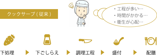 ご存じのように日本は世界に類を見ない超高齢化社会と同時に労働力人口減少に突入しています。 この社会は、これまでに経験のない異質なものであり、日本の政治・経済・社会保障など様々な面において、大きな影を落とす課題であることは明白です。この事実は、医療・福祉分野において切実な問題であり、サービス受給者(高齢者)の増加に対して、サービス従事者(医師・看護師・介護師·給食従事者など)が減少することを意味しています。現在においても、サービス従事者が依然として不足しており、今後更にそれが加速すると予測されます。これを解決する手段は、【人材を確保する】【生産効率を高める】2 つの方法しか現時点では見当たりません。従って、労働集約型の院内調理方式(クックサーブ方式)での給食提供では限界があり、弊社はその課題の解決として、病院・施設給食受託・食品製造加工の経験から【食の安心・安全】と共にサービス従事者不足を補うための【生産性を高める仕組み】をご提案いたします。