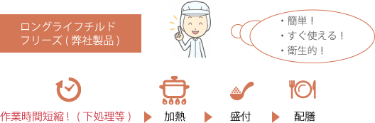 製造後、賞味期限90日~120日の完全加熱調理済み食品です。衛生的で長期保存ができます。完全加熱調理済み食品で長持ちするので、廃棄ロスやそれにともなう光熱費などを削減できます。また、非常時の食材としても使用できます。製造工程がマニュアル化されているため、品質が安定し、時間短縮と人件費の削減により効率化が可能です。近年、さまざまなチルド食品が開発されており、美味しさの保存技術も向上しています。